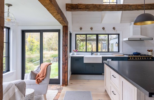 As you continue through to the first floor you’ll find a dining space that’s flexible for any party. While a round Restoration Hardware table is in place, an additional 8-person farmhouse style table is available upon request to provide seating for up to 14. The massive kitchen island looks out over the expansive views and spring fed pond. This kitchen calls for loved ones to gather; and serves as one of the several entertaining spaces throughout the home.