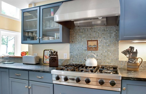 Entering the home, you will note the maple flooring and how the ocean-facing windows brighten the open-concept living and dining areas with the sun. If you plan to stay in for the evening on a chilly night there is a propane insert fireplace, a 60" flat-screen television, and a comfortable selection of quality furniture from New England's finest artists and craftsmen. You will find no shortage of comfort and high quality at this vacation home. In this space, you will also enjoy the large dining room table which seats 12 with an expansive view of the ocean. Off of the living room, you enter a large contemporary kitchen with new major appliances, ample counter space, an island workspace for creating culinary delights, and bar seating for five at the attached mahogany counter. The kitchen has a standard drip coffee maker, a Keurig, and an espresso machine. Directly off the kitchen is an informal breakfast area, with a cozy wood stove for four.