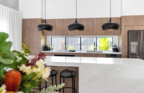 Discover this designer retreat in the heart of Palm Cove, where contemporary architecture and coastal elegance blend seamlessly. Sink into the stylish living spaces, cool off in the sparkling pool, or create culinary delights in the gourmet kitchen. Designed for indulgence and convenience, the home features three opulent bathrooms, a dedicated workspace, and central air cooling. Park in the secure garage, stroll along Palm Cove’s pristine shore and explore its vibrant dining scene.