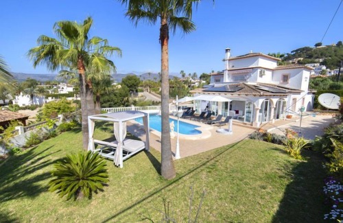 Large, beautiful villa "Septimo Cielo", 2 storeys. 4 km from the centre of Calpe, 7 km from the centre of Benissa, in a quiet, sunny position residential area (villas), 4 km from the sea, 4 km from the beach. Private: property 1'450 m2 (fenced), beautiful, well-kept garden, lawn for sunbathing, swimming pool (8 x 4 m, seasonal availability: 01.Jan. - 31.Dec.) with salt water, internal staircase, shutter cover and salt-electrolysis pool-cleaning system. Outdoor shower, terrace, barbecue. Supermarket 3.7 km, restaurant 3.4 km, bus stop 2.1 km, sandy beach "Playa de la Fossa" 4 km. Sports harbour 5 km, marina 5 km, golf course (9 hole) 10 km. Nearby attractions: Aqualandia, Mundomar, Terra Mítica, Terra Natura, Benidorm Palace (Benidorm), Les Fonts de l'Algar. The owner does not accept any youth groups.