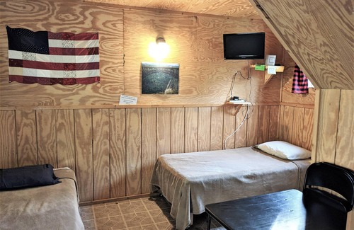 2 twin beds on the first floor, 6 twin beds on the second floor. We always stock our cabins with all bed linens, bathroom towels, soap, and toilet paper. The kitchenette has a two-burner electric stovetop built in, microwave, coffee maker, and a full-size refrigerator/freezer. We supply 2 small pots and 1 smallpan, paper plates, paper bowls, plasticware dishes, plastic cups, coffee and styrofoam coffee cups. There is a television but no satellite or cable TV. Feel free to bring your own DVD player, games, etc. and cords as we do not supply cords for devices. Free basic wifi - not good for streaming however. Outside, there is a covered porch with benches, your own picnic table and fire ring. You can cook on the fire ring and later push aside the grate to sit around the fire. Firewood is for sale on the porch. Guests have access to the parking lot and the yards behind the cabins. Feel free to bring a Frisbee!