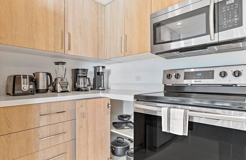 • Fully equipped kitchen and dining area with quartz countertops and stainless appliances