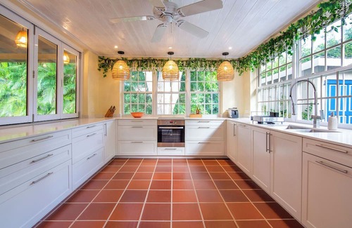 The outdoor area is spacious and cool with ceiling fans and island breeze. The kitchen leads out to the back patio dining area and adds a tranquil space for enjoying a leisurely meal. Enjoy the plunge pool and 6 loungers after a day on the beach or read a book on one of the seating areas on the covered verandah.