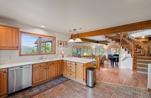 Experience luxury and comfort at its finest in this spacious Durango vacation home. Ideal for large groups and family reunions, this multi-level retreat offers breathtaking views of the Hermosa Valley and top-notch amenities, including a private hot tub under the stars. With multiple levels, including a bonus living area with a kitchen and bunk room for the kids, your whole group will have plenty of space to relax. Upon entering the lowest level of the home, you'll find a bonus living area with a kitchen and a kid-friendly bunk room, as well as a full bathroom. Additionally, there is a king bedroom with a full en suite bath on this floor. Moving upstairs to the main floor, you'll find a large living room with a gas fireplace, grand piano, and floor-to-ceiling windows showcasing beautiful views of the north valley. Enjoy the fresh mountain air and scenic vistas from the front balcony or gather around the fully equipped open kitchen and dining area for a delicious meal. There is plenty of seating for the whole family on one of the many sofas or window seats around the room. You can also enjoy the fresh mountain air and great views from the front balcony with outdoor seating, firepit, and gas grill. The open kitchen is fully stocked and makes it easy to cook for many. There is also a dining area, a half bath, and a laundry room on this floor. Another queen bedroom with a full en suite bath is also on the main floor, along with a lovely study room equipped with lots of books and a TV, making it a great place to curl up and read a book. The third floor houses the elegant master suite with a walk-in closet and a luxurious master bath with a soaking tub. Another bedroom with two queen beds shares a full bath with the spacious loft area, featuring a twin bed with trundle and additional loft space with three twin beds, accessible via a ladder. Recent AC unit additions on the upper floors ensure your utmost comfort throughout your stay. The owners have also just created a trail from the driveway to the neighborhood nature trail that loops around the adjacent National Forest land. Don't miss out on this extraordinary opportunity to experience Durango like never before and make memories that will last a lifetime at Rim Rock House.