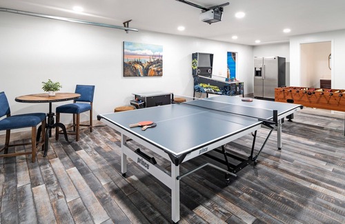 While the exterior spaces of this home seem to be the star of the show, the interior spaces are just as fascinating. This home comes equipped with a gameroom that will have you busy for hours on end. You'll find a digital pin ball machine, arcade game, billiards, ping pong, shuffleboard, and more! The fun activities are complemented by 2 custom murals painted by local artist @MindOfWij and make for great backdrops for family photos.