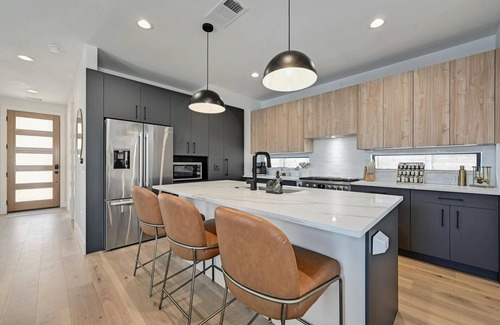 Welcome to our luxury oasis! This brand-new home boasts a bright open floor plan that opens to the backyard, pool, and oasis in the heart of downtown Austin. It has five bedrooms, four of which have king-size beds, four bathrooms, and a delightful loft. The loft is a perfect gathering space and features a bedroom, a full bathroom, and a queen-sized sleeper. The rooftop deck offers a serene spot to unwind and enjoy the view.
