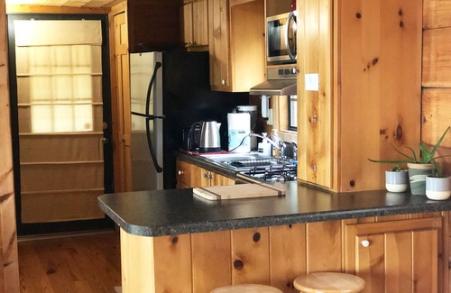 The cabin features a separate bedroom with a queen-size bed and a versatile sleeping/meditation loft, comfortably accommodating up to four guests.