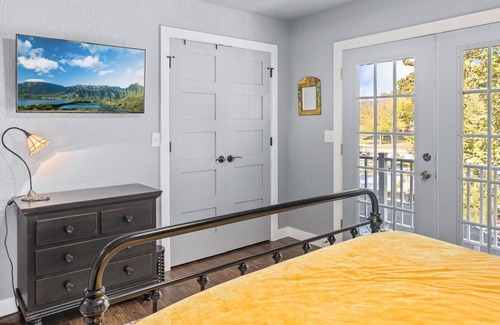 Head upstairs to find all three bedrooms and another bathroom. The bathroom features a large walk-in shower and vanity area with plenty of counter space. This room houses a large washer and dryer available for your use during your stay. There's also a smart TV in here! Two of the bedrooms offer queen size beds, while the third features a king size bed. Each bedroom features a flatscreen Vizio smart TV and access to a balcony.