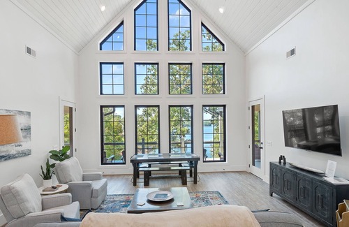 Two separate living areas and decks across the entire rear of house with separate sitting areas. Big water views and deep water to float and jump off 2 story dock, but no waves or boat traffic since it is tucked back in the cove....the best of both worlds.