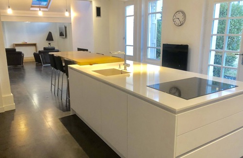 Kitchen with central island and large high table with bar chairs. Fully equipped (oven, hob, extractor hood, microwave, dishwasher, Nespresso machine, electric kettle, toaster).