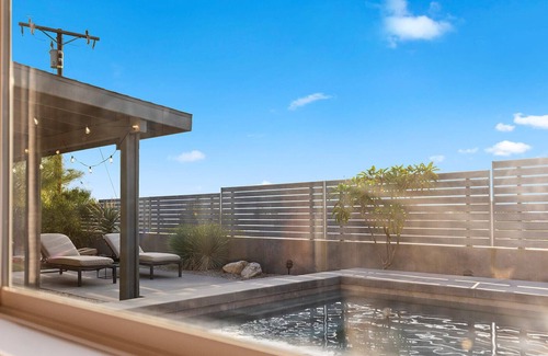 This desert oasis' highlights include private POOL and spacious backyard with panoramic views of the San Joaquin Mountains (incredible at sunset), equipped with lounge chairs, a PUTTING GREEN, corn hole, foosball and other games, a BBQ, as well as ample seating and dining space. The home is beautifully designed with Mid-Century Modern decor and features an updated kitchen and bathroom with beautiful fixtures and high quality appliances, and all of the necessities (small and large) to entertain and enjoy your desert getaway to the fullest. With only one neighboring home, The Hidalgo House backs up to the mountains, providing privacy and unparalleled views of the land, sky, and stars. Perfect for a family or group of all ages, The Hidalgo House's ambiance, location, amenities, and vibe will make you want to return again very soon....