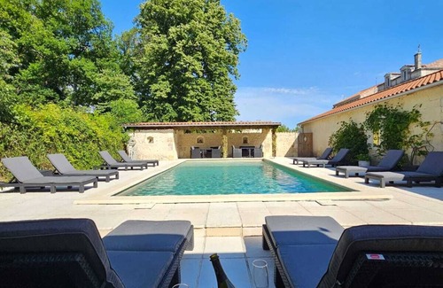 The stunning 'Nautical Suite’ spans the entire first floor of ‘La Maison Chaleureuse’ that stands proudly in the heart of Ribérac, enjoys scenic town views and overlooks the pool and fabulous outdoor living areas where you can relax and enjoy a delightful holiday experience in sunshine or in shade. Within walking distance of Ribérac's cafés, bars, restaurants and renowned Friday morning market, the lake beaches of La Jamaye and Aubeterre are only a fifteen minute drive away. Guests also enjoy visiting pretty Brantôme, historical Périgueux and cosmopolitan Bordeaux. The Nautical Suite has a fully equipped kitchen, fridge freezer, dishwasher and clothes washing machine, free on site parking and Wifi and is beautifully decorated with gorgeous French furniture and sumptuous toile de jouy fabric that reflects a nautical theme. It is the perfect choice for honeymoon couples or true romantics seeking a charming, idyllic, stylish retreat.