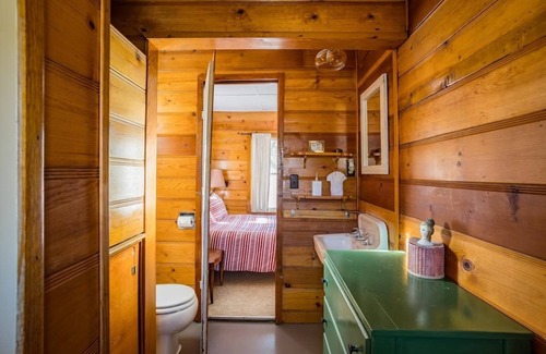The bathroom, considered large for a small cabin, is just next to the bed. This cabin has a window AC/heater the efficiently cools the cabin in summer and heats the cabin in winter. There is also a pot belly stove for heat if that is preferred. This sister property to Stoney Pines at Lake Isabella is a perfect studio style 1950's cabin.