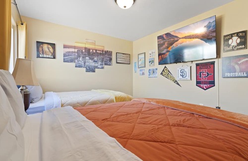 The first-floor bedroom, dedicated to San Diego's sports scene, showcases a vibrant celebration of various athletic pursuits. With dedicated decor reflecting baseball, skateboarding, surfing, golfing, volleyball, fishing, and more, this space pays homage to the diverse and energetic sports culture of the city. Guests are invited to immerse themselves in the dynamic energy that defines San Diego's sporting spirit within this coastal paradise.