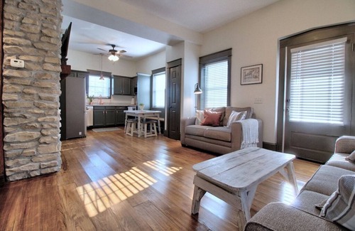 "The St. Charles Guest House" is a beautifully renovated and decorated home in the heart of Historic St. Charles, MO. This luxurious rental has 3 bedrooms and an extra sleeping nook that sleeps 9 total. Groups and families will have a great time here with it's lovely full kitchen which is open to the living room and includes a huge stone fireplace between the two, bed nook under the stairs perfect for relaxing or an extra sleeping place, fun and unique game room, and floor plan with plenty of room to spread out. Two upstairs bedrooms feature a queen bed with a twin mattress pullout in one, and a full and twin bed in the other. The super cozy master suite is tucked away on the opposite side of the house from the kitchen/living room area and feels like a retreat in itself. It has a built in king bed, reclaimed barn wood ceiling, it's own heating and cooling system, and fireplace making it perfect for couples getaway as well! There's a great view from master suite of Main Street and all the way down to the river!