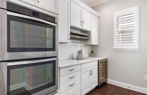 Kitchen is perfect! Stainless steel appliances, quartz countertops, double ovens, lots of cabinetry, farmers sink, gas range and best of all an additional bar area with a wine cooler. The large island has additional seating for 5 guests. Enjoy a well-stocked kitchen with every modern convenience you would expect.
