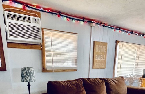 The cabin can sleep up to 6 people. It has 2 bedrooms, a full bath with shower and tub, and a fully equipped kitchen. The living room has plenty of room to spread out. There is A/C and heating.
