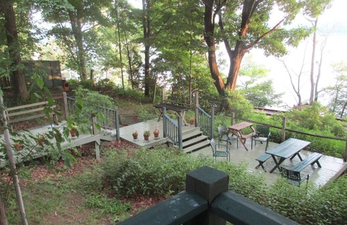 Not handicapped accessible: 28 gentle stone steps from the road down to the house, 3 to 6 steps between the decks, steep stairs down to the dock, boat house, and pebble beach, and in the house, a library ladder up to the sleeping loft.