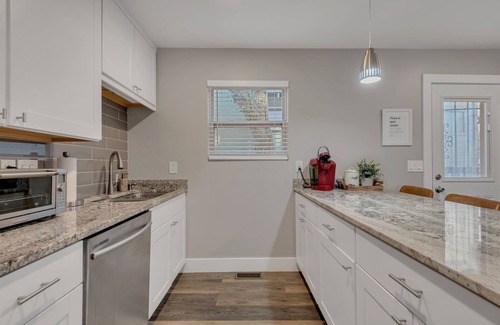 The keyless entry leads you into a spacious living room with a TV, a half bathroom, and a full kitchen. The kitchen is fully equipped with brand new appliances, a Keurig, dishes, cookware, silverware, and an island with barstools. The upper level has 2 comfortable bedrooms: a master bedroom with 1 queen bed and a bedroom with 2 queen beds. The second bedroom with two beds also has a desk you are welcome to use during your stay. There is also a full bathroom and washer/dryer with laundry detergent.