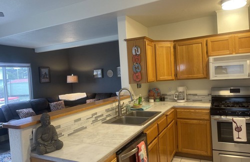 Oversize one bedroom, ground level apartment with a queen size bed, reclining chair in the bedroom to enjoy a good book or peacefully. Observe the beautiful ocean canal running out the window. Large comfortable reclining couch 75 inch screen TV with streaming channels on Roku. The open living room into the kitchen and dining space With glass slider doors to the back patio with seating to overlook the beautiful canal. The oceans beach 100 feet from the front door with panoramic view of the north and south jetty points. Walking distance to gills by the bay eatery the Hilfiker Trail, as well as other nature trails. Walking distance to city bus transit.