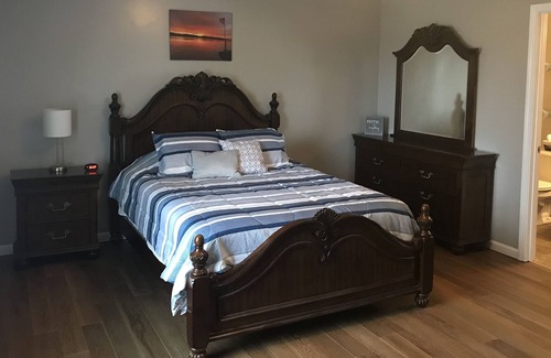 Master bedroom has a queen size bed with a 43" TV with Amazon Fire TV Stick and walk-in closet. Master bathroom includes a walk-in shower.