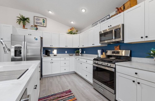 Lucky Seahorse Villa’s fully equipped kitchen includes everything from high-quality cookware to a KitchenAid stand mixer. Whether you're whipping up a quick breakfast or crafting a gourmet meal, this kitchen is ready for any culinary adventure.