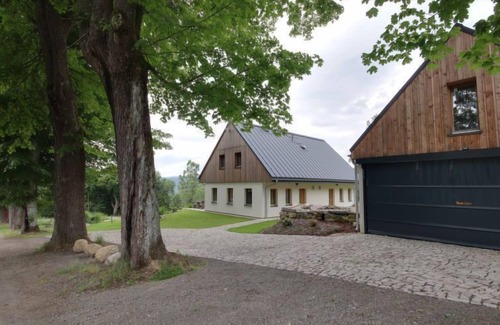 Cosy chalet "U Krále", 2 storeys, detached. Kořenov / Příchovice, in a quiet, sunny position on top of a hill, 2 km from the skiing area. For shared use: beautiful garden to relax, biotope. Terrace, garden furniture, barbecue, fireplace, children's playground, parking at the house. Supermarket 6 km, restaurant 1 km, café 1 km, bus stop "Světlá / Příchovice" 100 m, railway station "Tanvald" 4 km. Minigolf 2 km, ski lift 2 km, ski rental 2 km, ski school 2 km, children's ski school 2 km, cross country ski track 1.5 km. Nearby attractions: Štěpánka 2.5 km, Maják J. Cimrmana 2 km, Dinopark,Gigantei (Pl) 30 km, Ski muzeum,skokanské můstky,Šindelka 10 km, Mumlavské vodopády 13 km, vodopády Černá Desná 10 km. Well-known ski regions can easily be reached: U Čápa 2 km, Rejdice 4 km, Tanvaldský Špičák 10 km. Hiking paths: vodní nádrž Souš 10 km, Jizerka 15 km, Kořenov 7 km.