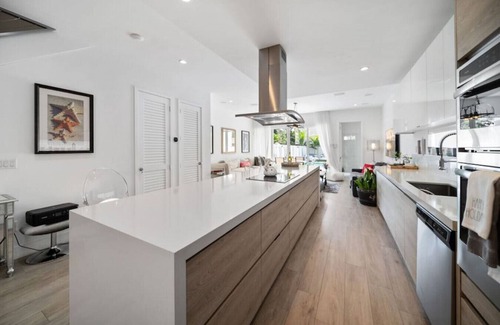 Have fun with the whole family at this stylish place. 8 bedrooms, king size beds, 2 heated swimming pools, 2 different entrances if decided to have more privacy, the townhouses communicate at the pools. Peaceful neighborhood, next to Coral Gables. Beatiful brand new and spacious house with very high ceilings,modern design and highest quality . Highly comfortable ,cozy and elegant. Walking distance to known Miracle Mile with the best restaurants and stores in town.Very well located with access to everywhere. Unique 8 bedrooms townhouse , pools has a Smart technology , AC in each floor, integrated E Locks, fully equipped kitchen, and full access to private swimming pools which comunicate both townhouses .