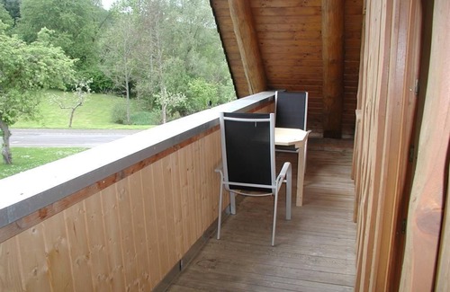 The apartment is located at the foot of the Erbeskopf, directly at the National Park Hunsrück-Hochwald, between Idar-Oberstein and Trier, in a Canadian round-trunk wooden house. The apartment can be used for 2 to a maximum of 4 persons. The ground floor has a separate entrance, hallway, kitchen with dining area, guest toilet and a partially covered terrace in the entrance area. Upstairs are a spacious living room with sofa bed, a barrier-free bathroom with shower and toilet, a bedroom with a covered balcony. The staircase upstairs is equipped with a stairlifter. The wonderful landscape, the special flair of the wooden house and the lovely furniture invites you to relax. The naturopathic practice in the house offers you the opportunity to arrange therapy and wellness treatment appointments.