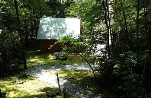 This cozy tiny cabin is about 15 yards uphill from the parking area.