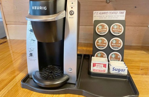 You'll also enjoy a full kitchen with a Keurig Coffee maker, plush living room furniture in front of the gas fireplace, and a 4K Roku TV with all the streaming apps! Outside, enjoy the nature of grilling on your own charcoal grill, or enjoy the open fire in your private fire ring.