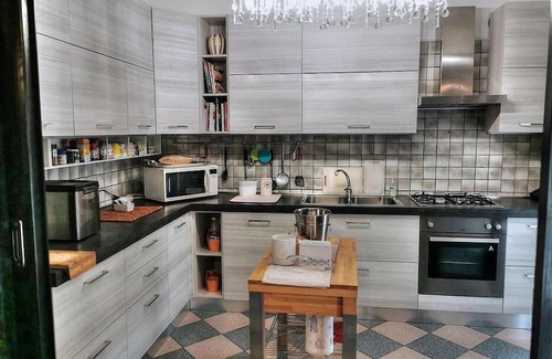 You will be able to enter the kitchen from the first living room through a large sliding door. It is equipped with a four-burner gas cooker, a gas oven, a refrigerator with freezer, a dishwasher, a microwave oven, an Italian-style coffee-maker, an American-style coffee-maker (bring your filters!) and a kettle. From the kitchen a French door will take you to the patio.