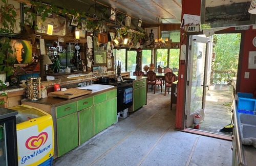 Walker world is more of an experience then just a stay, with more than 10 acres of art sculpture Orchard Barnes piano Shacks and Black River it is a constant source of awe and entertainment to old friends and newcomers not for the faint of heart come and enjoy the magic and philosophical freedom that the idea of Art embodies. The main house has a 60 ft wooden rowing skull piercing each end hanging outside 15 ft and 8-man rolling skull upside down with little leather shoes and shoe strings hanging down with wine bottles filling the voids of each end of the house that fill up with light during the day a 30 ft tall Agave flower inside the main Salon artwork everywhere wrought iron stairwell brass beds radiant floors windows and trees balconies porches fire pits pontoon boats patios fireplaces flowers Old Mercedes it's all here somewhere.