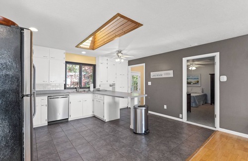 This home features 2 bedrooms and 1 bathroom. Bedroom 1 has a queen bed and bedroom 2 has two queen beds. This home is all main floor living with a large living room with view of Lake Michigan! The outdoor area at this home is great! It features a large yard, in ground trampoline, outdoor furniture and charcoal grill! The sunset views from the bluff are amazing. Barbecuing and watching the sunset makes for our favorite dinner location, but the Old Channel Inn right down the road is a close second. This home has an occupancy of 6 people maximum and is monitored closely.