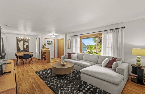 Stay steps from shopping, dining, and trails in downtown Delafield. This stylish, well-equipped home features three comfortable bedrooms, two full bathrooms, and multiple living areas designed with groups in mind. Cook with ease in the fully stocked kitchen with stainless steel appliances, unwind in the finished basement complete with a BYOB bar and game area, or enjoy coffee and conversation in the private backyard. The home also includes an in-unit laundry area—perfect for week-long or monthly visits—and parking for up to 6 vehicles, a rare convenience in this charming downtown location.