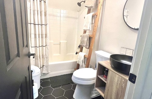 Cabin 2, named The Blue Jay, is the second cabin you will see when you enter this amazing property. This cabin sleeps 8 and has everything you need to feel right at home. Upon entering the cabin you will find a spacious and open living room with a gas fireplace, couches and chairs, and a TV. The perfect space for relaxing! The kitchen is open to the living room and is fully stocked, with full appliances, dishes, pots and pans, everything you need to cook up your favorite meals! The laundry closet in the hallway has a full sized washer and dryer for your convenience. Down the hall you will find the master bedroom with a king sized bed and an ensuite bathroom with a tub/shower combo. Bedroom 2 features a queen sized bed, and the bunkroom holds 2 sets of bunkbeds as well as 2 trundle beds! *Trundle beds are only suitable for small children*. There is another full bathroom in this cabin with a tub/shower combo.